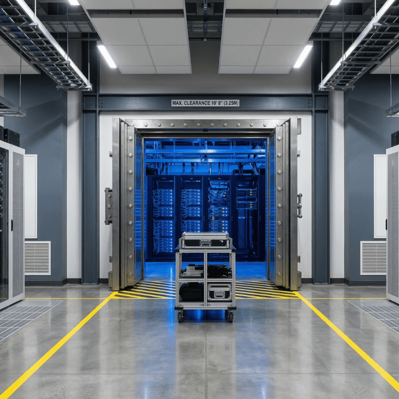 3. Safe Access at Every Point: Doorway and elevator opening heights from 9′ to 10′8″ are standard across our facilities. Moving heavy equipment from loading dock to module floor is controlled, low-risk, and planned, not improvised. Every access point is sized for the loads that real deployments demand.